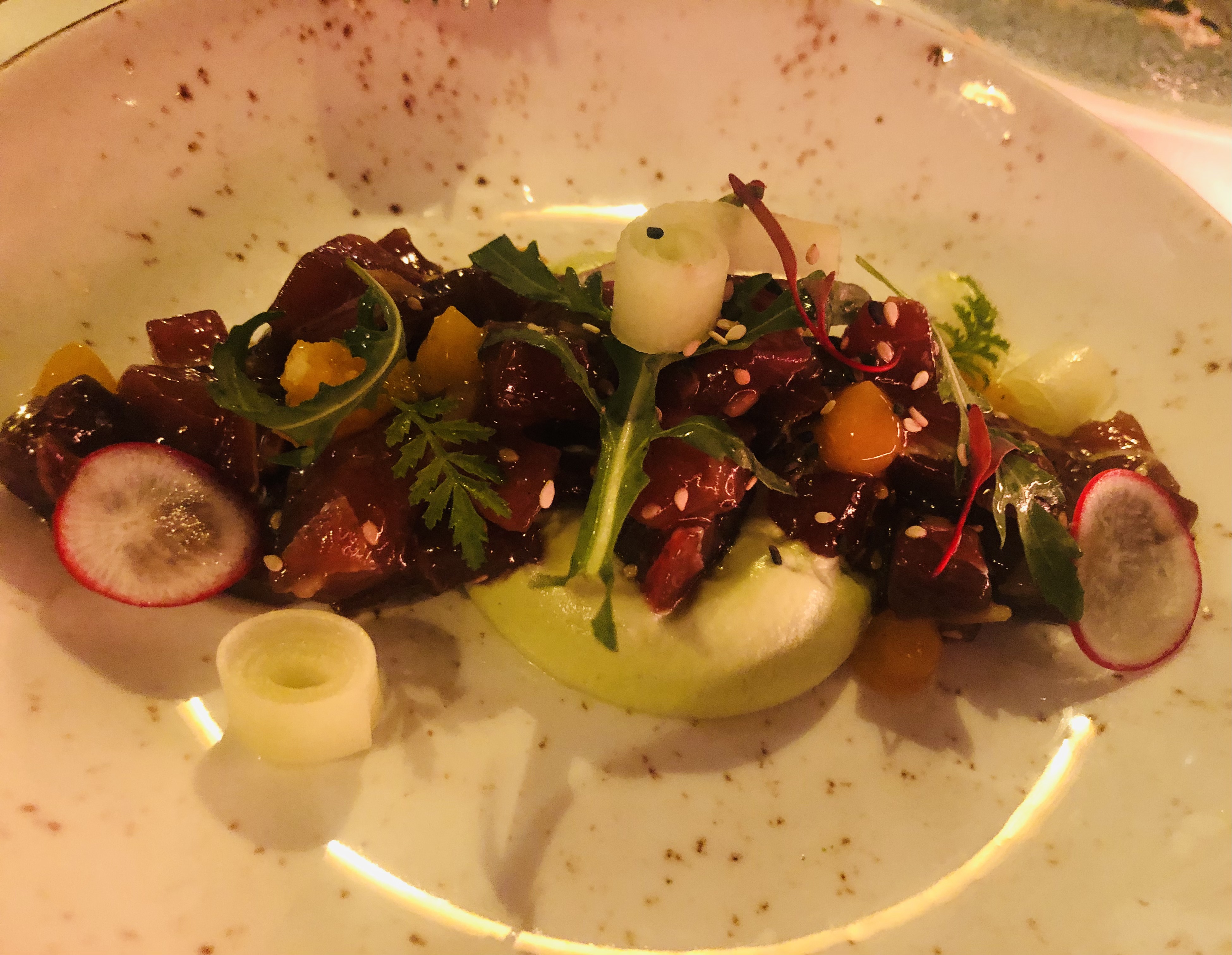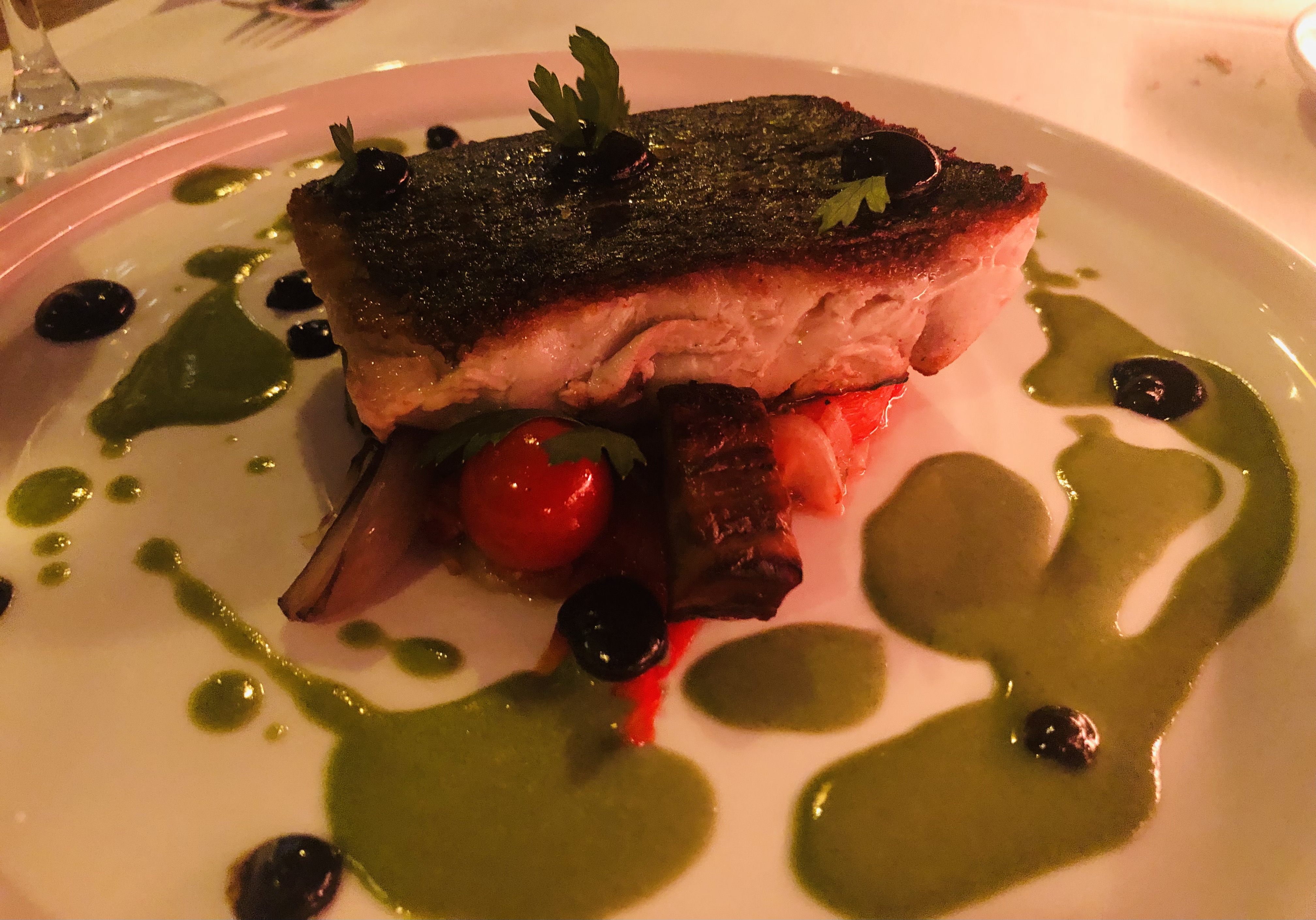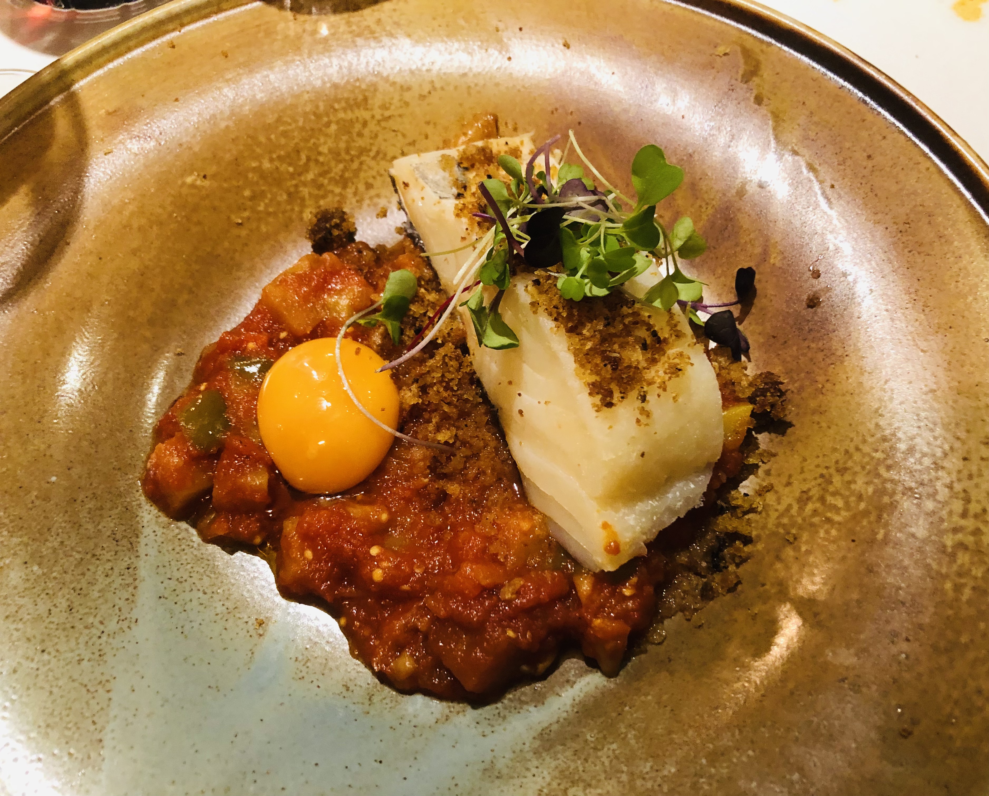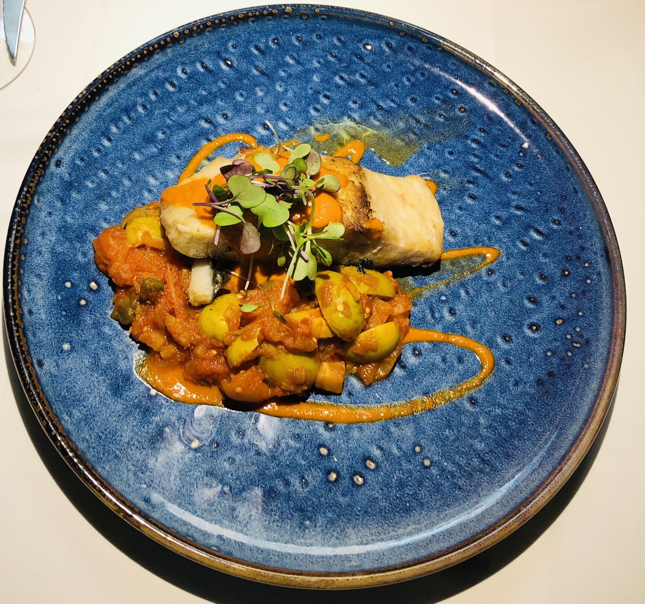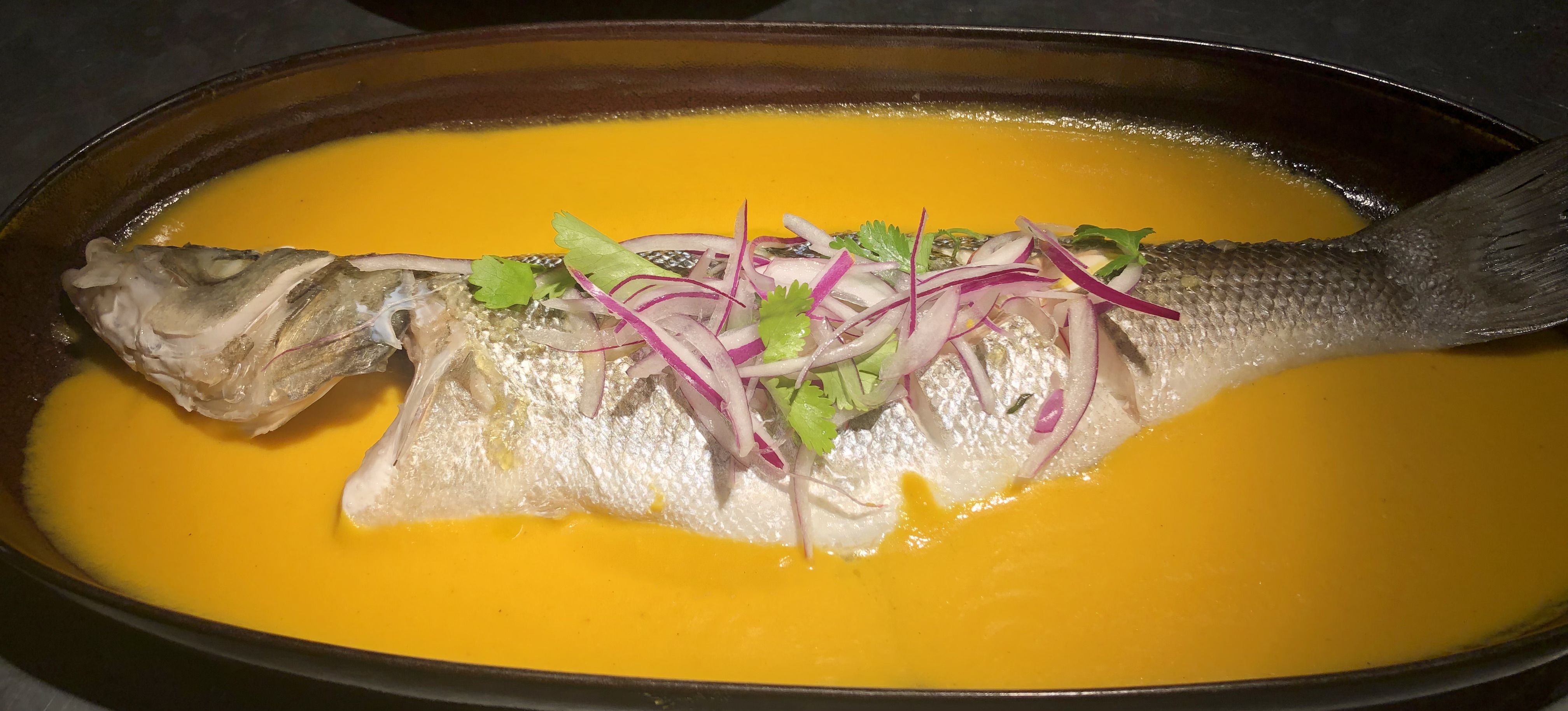 Y Llegamos al segundo “Lubina al vapor con escabeche” una mezcla entre ceviche sin serlo y escabeche, espectacular también.